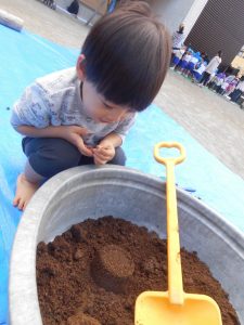 早速、スコップで泥をすくってバケツの中に入れたり、お母さんと一緒にやりとりを楽しみながら遊んでいましたね。
