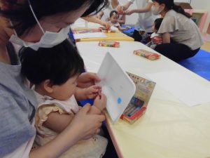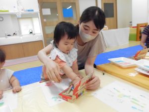 お母さんと一緒にキットパスを手に持ったり、色のついたトレーを手で触れたり、初めていろんな色の世界に触れて楽しかったね😊✨