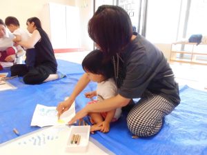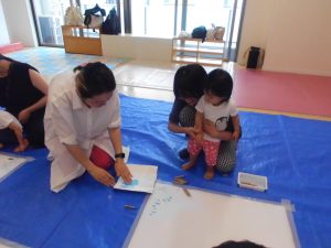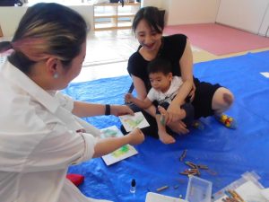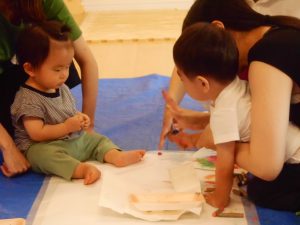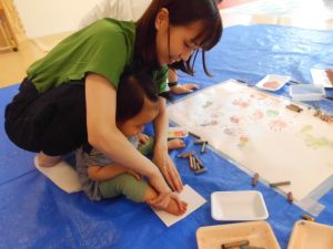 キットパスの感触やイベントの雰囲気に慣れてくると、講師の先生とタッチをして手形を取る準備中のお子さんも😆🙌
