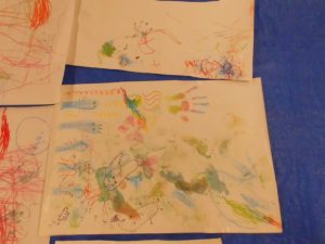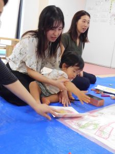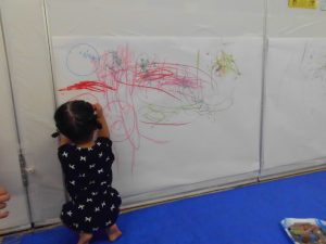 床面の紙だけではなく、壁面の紙にも黙々とお絵描きしているお友だちもいました😊